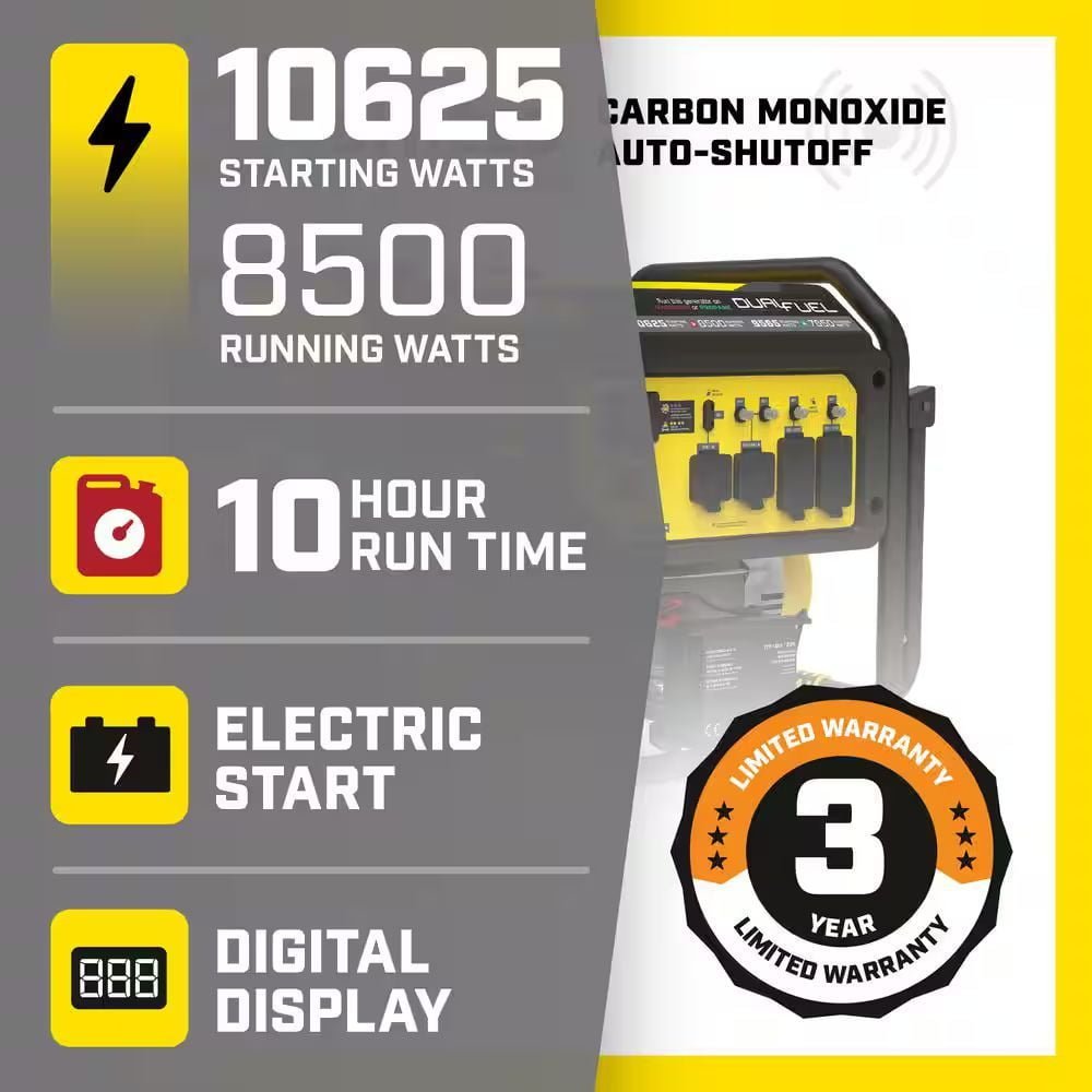 Champion Power Equipment 10,625/8500-Watt Electric Start Gasoline and Propane Powered Dual Fuel Portable Generator with CO Shield
